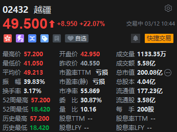 3月12日消息,越疆早盘拉升大涨一度超40%,现报49.5港元哪个股票平台好,成交额5.58亿港元。